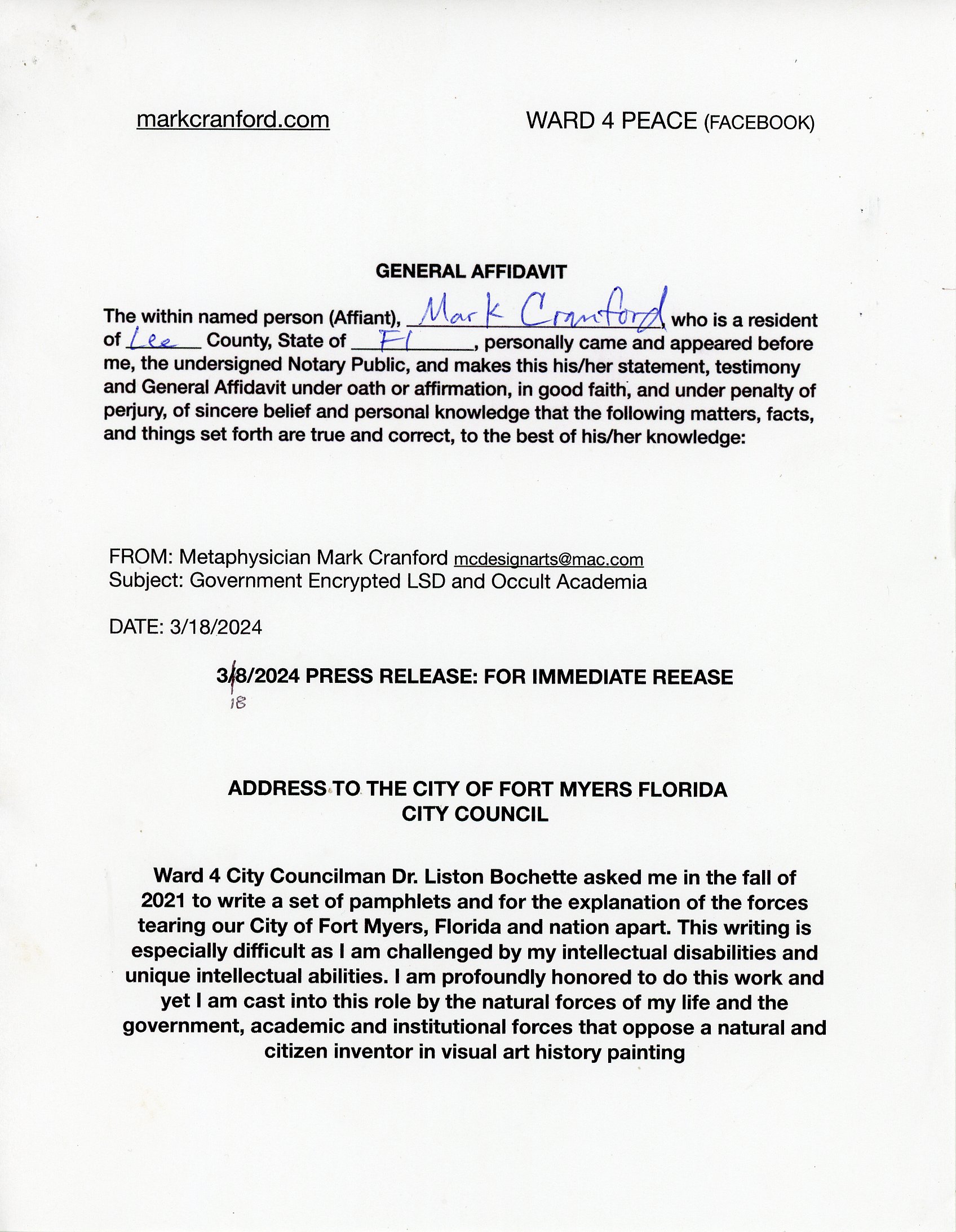 2024/03/18 Government Encrypted LSD and Occult Academia By Mark Cranford|2026-01-13T20:37:05+00:00March 29th, 2024|Affidavits for Civil Rights Reports|Comments Off on 2024/03/18 Government Encrypted LSD and Occult Academia Share This Project With Other Creatives! FacebookXWhatsAppPinterestEmail About the Author: Mark Cranford Mark Cranford Dr. Mark Cranford, Metaphysician, conceptual artist + excellent environmentalist Seer. amazing title from Pulitzer Prize Art Critic Jerry Saltz Related Posts 2024/07/15 H L Cranford, Duke Power, Duke Energy 2024/06/03 City Of Fort Myers, Florida Bureaucracy Of WAR, government academic occult women’s artist revolution 2024/05/23 White Out at Historic Preservation Committee May 23, 2024 2024/05/07 New Pink Dot Power Icons 2024/02/04 The City of Fort Myers Public Art Collection 2013 2024/01/02 The One Direction, The Two Direction,The Freeze Of Time 1-2-2024